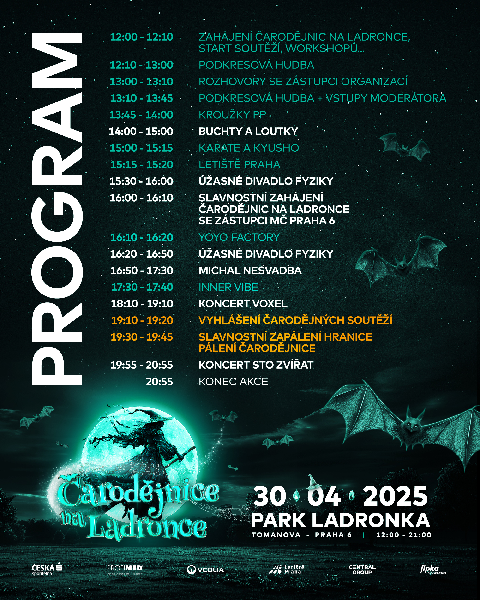 Čarodějnice na Ladronce všem návštěvníkům vykouzlí úsměv na tváři díky bohatému hudebnímu programu na podiu s koncerty známých kapel, zábavným soutěžím i sportovním a jiným doprovodným aktivitám. Těšte se také na gastronomické pochoutky.